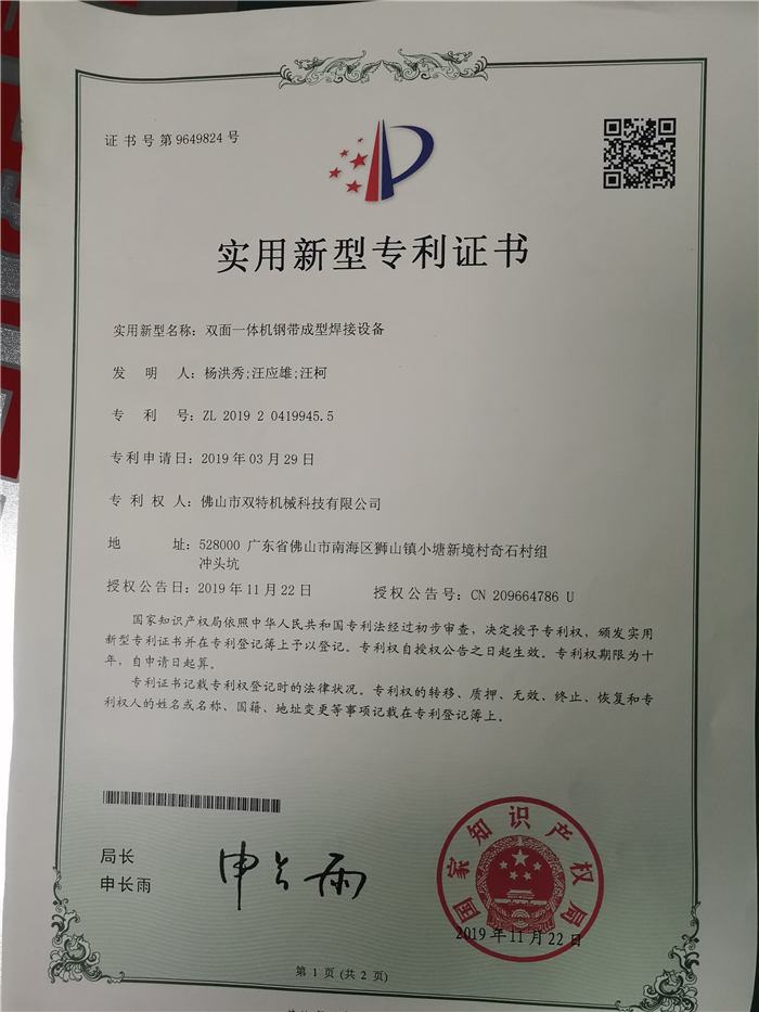 雙特制管機專利證書